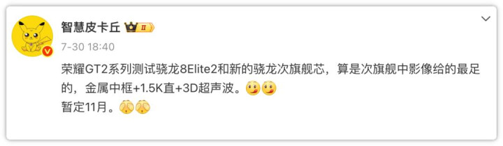 最近荣耀GT2系列也迎来了爆料,有博主称荣耀GT2系列测试骁龙8 Elite2和新的骁龙次旗舰芯,算是次旗舰中影像给的最足的,金属中框+1.5K直屏+3D超声波,暂定11月。