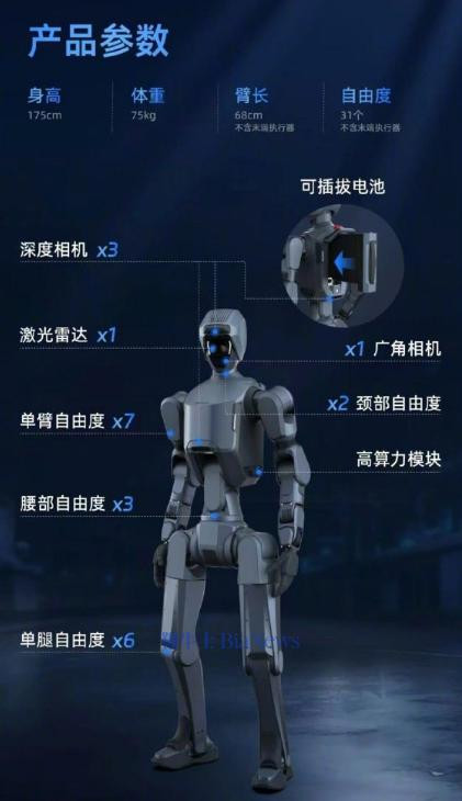采用高度拟人化设计,身高175cm、臂展68cm,接近成年男性体型,可无缝适配人类现有工具与作业空间;